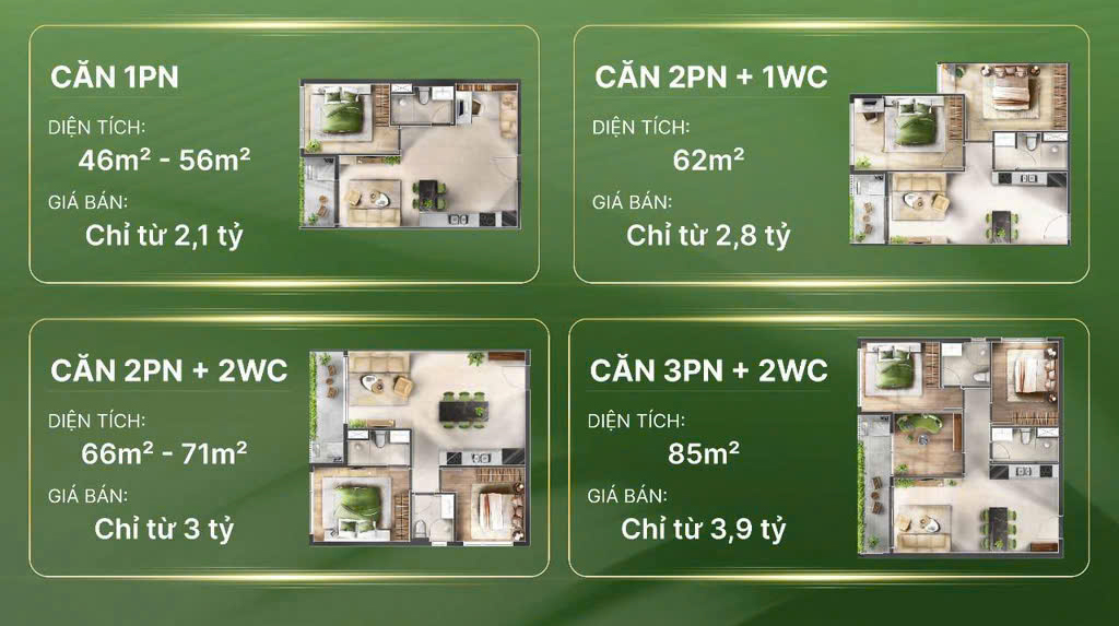| Diện tích căn hộ | + Căn hộ 1 PN có diện tích từ 45 m² – 55 m² + Căn hộ 2 PN + 1WC có diện tích từ 55 m² – 60 m² + Căn hộ 2 PN + 2WC có diện tích từ 62 m² – 74 m² + Căn hộ 3 PN có diện tích từ 80 m² – 90 m² |